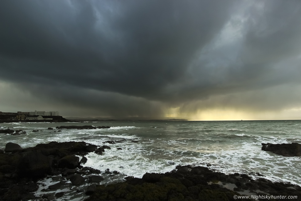 We decided meet at the coast during daylight incase there was a good sunset, also radar indicated cells moving in from the W so I was hoping for cool storm clouds while waiting for nightfall. I left during the late afternoon and arrived at Portstewart where John and I had arranged to meet. I grabbed my camera bag and 100-400mm lens and went for a walk along the shore enjoying the fresh sea air. I spotted mean looking skies heading my way so I replaced the 400mm with the 10mm and got shooting, this cell looked very dark and was newly born, first a black dry base, then curtains of precip began to fall then within five min's it sported a massive curtain of hail stones traversing a good 160 degrees of sky, the hail looked impressive back lit by the lowering sun. On the left is Portstewart Convent which is now Dominican College and to the right on the horizon was a ship about to get a soaking under this cell, I have an interest in tracking ships so I knew it was a small cargo ship called ISIS which was waiting to get into Coleraine.