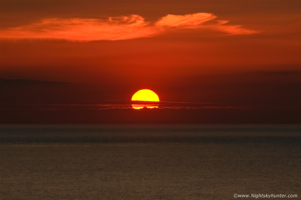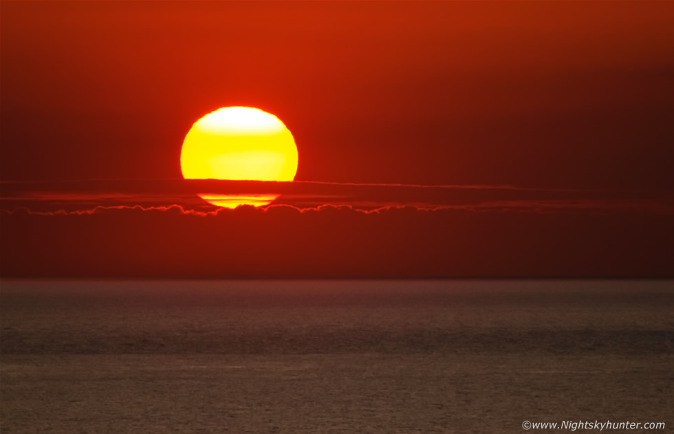 I landed the drone, packed it away, went back to the van and attached the 100-400mm lens to the DSLR and walked along the church path and into the graveyard. A stunning sunset greeted me when I walked around the corner, I leaned on an ancient head stone and began taking stills. The solar disk was large and easy to see with the naked eye as it hung in the sky close to the flat ocean horizon, it was without question the nicest sunset I had seen this year to date. The disk is yellow in these images however visually the sun was a mesmerizing red oblong with the limb bent and distorted by atmospheric extinction.