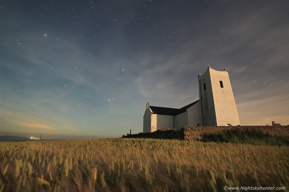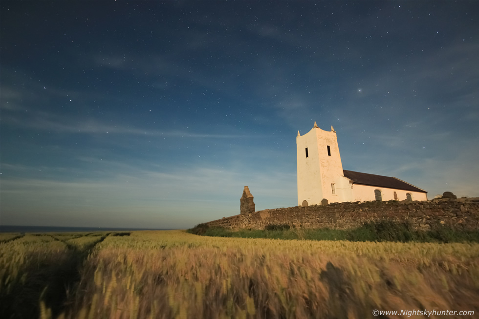 I began shooting a star trail, same settings as before except now 25 seconds to accommodate the slightly darker sky. The camera was perched high on the tripod dong it's thing while I hunkered down in the trail, I was immediately surrounded by crops and from inside it was dark, warm and very cosy, I could have fallen asleep here. Behind me, unseen and hidden in the darkness was John doing the same thing, I couldn't see him at all however we talked to each other quietly from inside this vast field. I smiled with delight, this moment was surreal, earlier in the day I never would have thought that I would be doing photography from inside a barely field at 02.00 in the morning. Moonlight shone on the barely tops and as I looked up I saw the famous church tower surrounded by circumpolar stars aloft while across the zenith the Summer Triangle shone proud.
