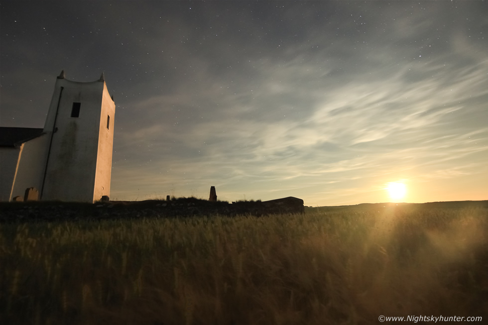 I packed a lunch, filled a flask, dressed appropriately and packed my camera gear and the drone into the van, I figured if I arrived in time I might get a chance to film the church from the air. Before I left there was a beautiful formation of lenticular wave clouds in the western sky near Maghera surrounded by blue skies and in the east I could already see the rising moon, it seemed full of mystery and wonder about what lay ahead. I left a little early and with the exception of getting held up by slow drivers and tractors the going went well and I arrived at Ballintoy at 20.00 BST. I quickly got set up in a barley field surrounding the old church and did two drone flights over the fields and around the church itself, the light was gorgeous during golden hour with the fields lit into wonderful warm light by the setting sun. I also bumped into photographer David Laverty who I had never met before and we had a nice chat about flying RC planes, drones and the beautiful evening we had been rewarded with for a photo shoot.