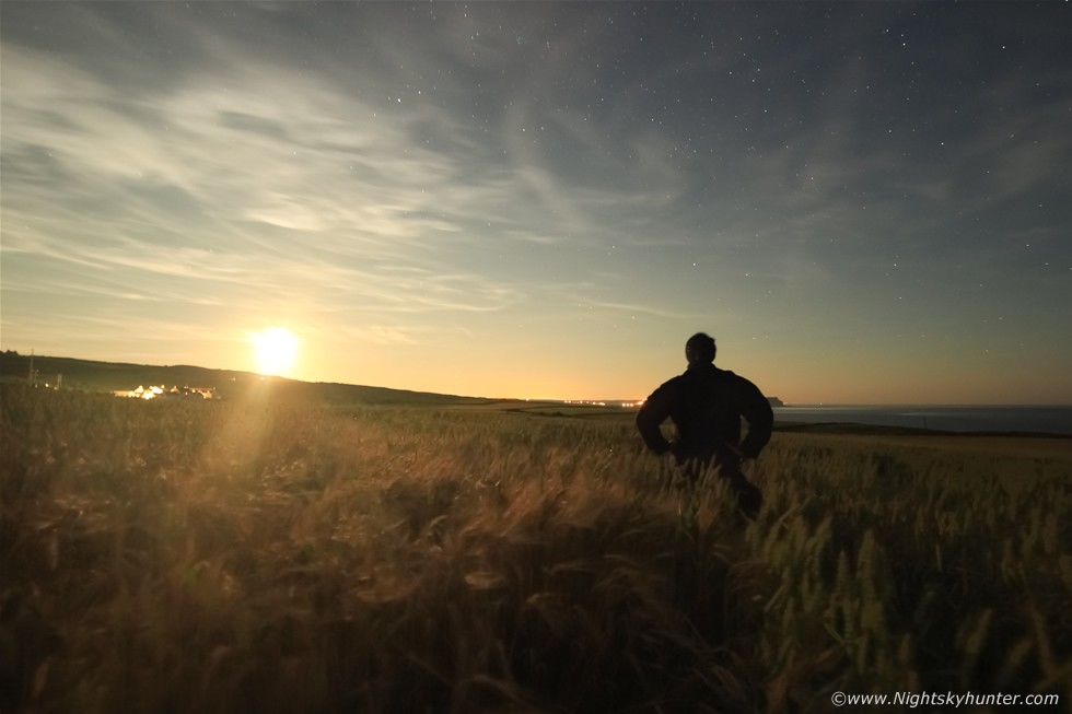 I don't normally do selfies and I actually detest the modern day term, I have always preferred to call these scenes memory shots, so I decided this night was worthy of such an image so here's me in the moment loving being surrounded by nature and under the stars with the golden moonlit barley crop making this night feel like I was living a dream. We called it a night and as we were driving home the setting moon looked remarkable, through my windscreen I could see John's van in front, dark trees and this massive orange-red moon seemingly hanging over the roof before it vanished in the darkness, the moon seemed so close I felt I could have touched it, John would also comment on this amazing moon sighting which made for the perfect ending for the perfect night from sunset to moonset, I was back at home for 04.00 then asleep for 05.00.