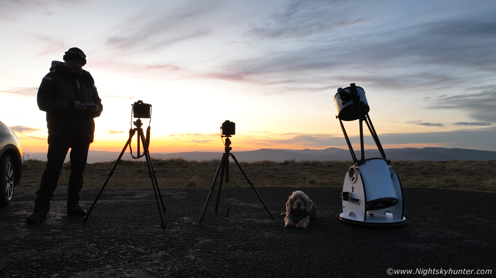 I set up two cameras, the 600D with 50mm lens and 5D Mark IV with 100-400mm lens. I also set up the 10" reflector and had the binos around my neck. The sky was still glowing after that sunset so I got the drone in the air, the wind was blowing strong but I was going to document this moment no matter what. This is the set-up with Rhua and I on patrol, she was watching the drone as usual with amusement.