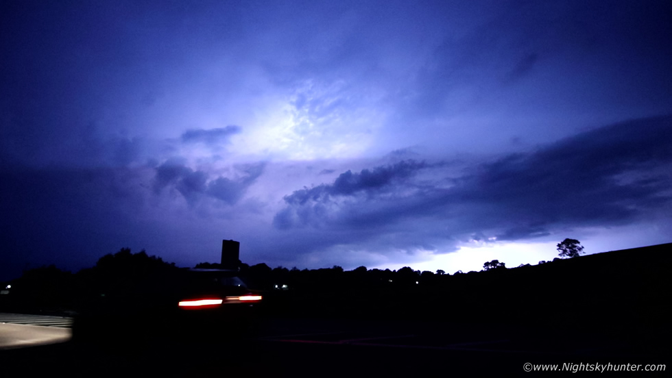 The passing traffic made for interesting photo opportunities as we could now capture light trails with the storm in our exposures. The sky was flashing and pulsing with light, it was absolutely surreal, Paul said the storm was still a good 20 miles away from us which was amazing, and what made the experience even better was that we were completely dry, there wasn't a drop of rain on us. Parts of Co. Fermanagh under the anvil were getting a remarkable show with pink and purple anvil crawlers almost constantly creeping across the sky like large electrified spiders. Power was knocked out and many said it was the 'worse' lightning they had seen since 1985.