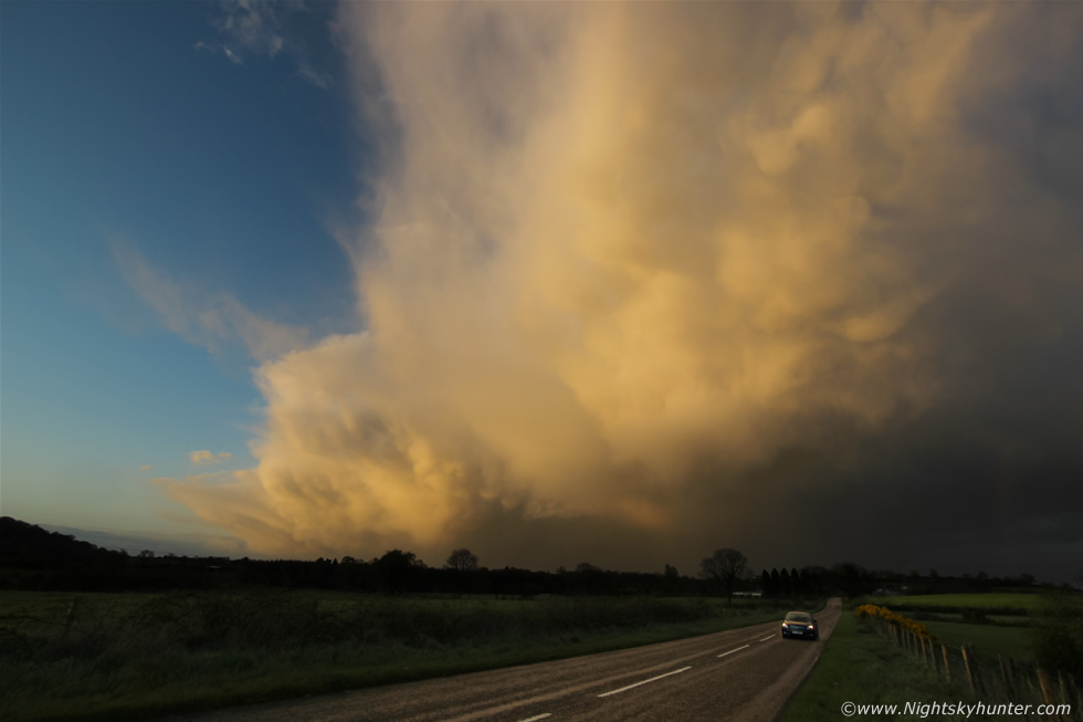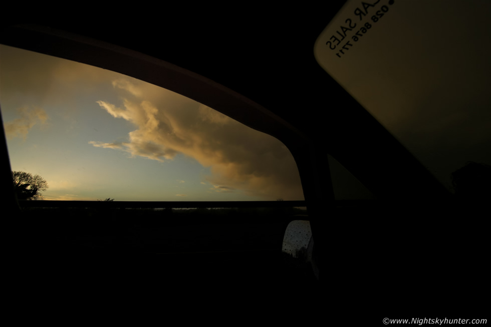 I could see the back edge of the anvil coming into view, storm chasing is all about making remarkably fast decisions, one not only has to determine what is happening at the current moment but also project into the future where the cell is going and hence where to chase it or at least park to observe the phenomena on display, I was faced with this very dilemma rite now, a bad decision could cost me a missed photo opportunity. The W side of the cell looked much better defined however it was miles away and I would need to drive N along the Coleraine road to catch up with it, that was all very well and good however it would take time to get up that road, plus the trees on either side would block the view and the show would be over by the time we found a decent clearance. For that reason I decided on the E side of the anvil because I would have a much better open view across the countryside and the NE motion of the cell would bring some of the W side of the anvil into view as well so I made this decision in about 2 sec's and went in that direction driving as fast and safely as I could. We arrived into the countryside on Crewe Road and pulled onto the grass verge near a gate to a field which I have used countless times in the past for storms and NLCs. Rain drummed off the roof and through the windscreen a red rainbow was putting on a nice show for us. Then suddenly the clearance arrived over us and out to the NW I could see the W anvil all lit into surreal warm colours complete with numerous mammatus pouches, I asked my Mum to put down the passenger window, here's a 10mm shot capturing this spectacle unfolding.