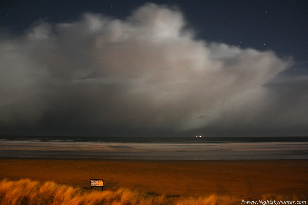 Downhill Beach is miles long however after two miles we stopped when we saw a big shower coming in from the W making a beeline straight for us so we knew we were in for a proper soaking when it arrived, however this sparked a thought, bright moon less than 42 degrees high behind us and an approaching shower at the lunar opposition point which meant there was a very good chance of catching a rare moonbow. Long before the shower arrived a segment of bow formed and I shouted to Roisin to look towards the NW near the distant lights and sure enough she saw it too and as we watched it grew into a pale ghostly arc which stretched across the entire sky then intensified to the point were we could see subtle colours, Roisin was highly impressed, this was her first ever sighting of a moonbow and the experience was unforgettable but before we had time to enjoy it the clouds covered the moon and all natural light was shut off and it was gone just as sleety rain soaked us. I promised Roisin we could see another moonbow later and when it appeared I would try and get a decent image of her standing in the frame. This was actually the first time that I had captured the reflection of a primary moonbow, I can see that there is excellent photo potential here on a good flat wet beach so this is something I might just spend more time at in the future.