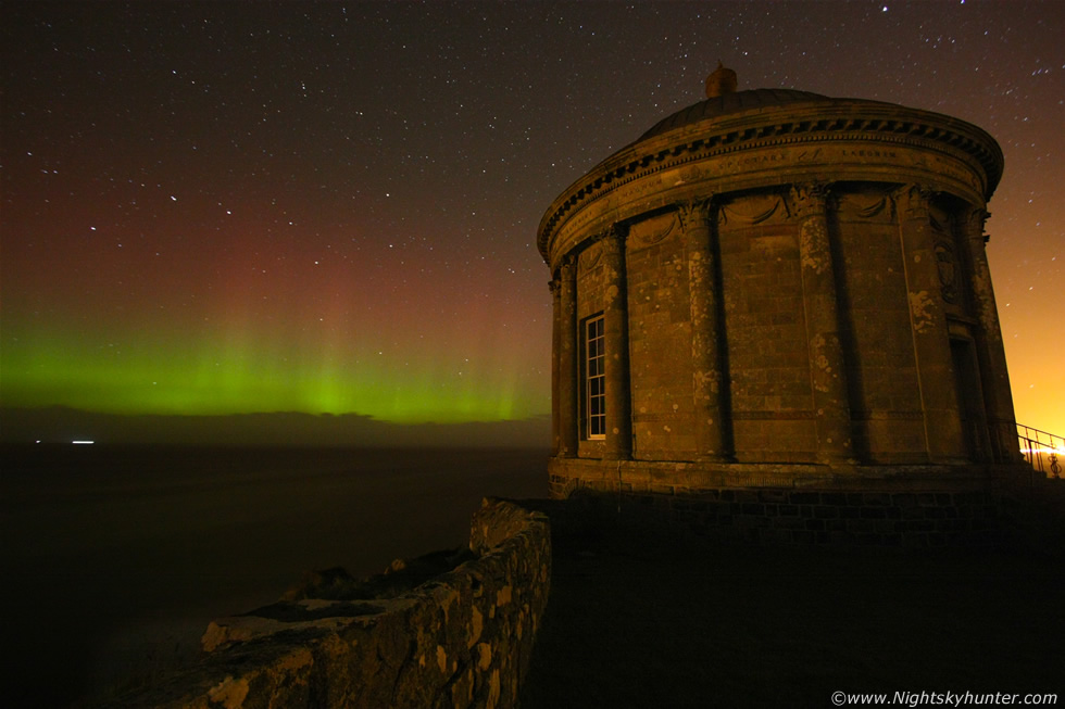 We arrived at the coastline in good time between Castlerock and Downhill Beach, we wanted to shoot any aurora from Mussenden Temple, Paul and I had been there two weeks previous when a faint aurora was manifesting and we both found several nice angles, I had my heart set on one particular angle and just needed a good aurora to complete the scene, we said back then we would be back at Mussenden again when a more serious aurora was expected, so here we where. However this time we had Steven who is also a photographer but he had never seen a real aurora display before and was eager to catch his first on camera, this made me nervous as he had traveled all the way from Omagh and had an early rise the next morning so I hoped that nature would show off and make the night worth the drive for him. As soon as we got out from the car we saw the aurora in the northern sky even before full dark adaption set it so we cheered and were happy because we had already succeeded so we walked further down the dark trail until the majestic form of the Temple came into view. The aurora was an obvious glowing enhancement stretching across the NW to E of N sky sectors 20 degrees high with no structure. After a little time we could have swore we saw faint beams at the limit of vision then Steve and I saw a very faint red colour above the green arc, we all concluded the aurora was maybe getting stronger and was definitely changing by the second so we all split up and went our separate ways to do photography on our own.
