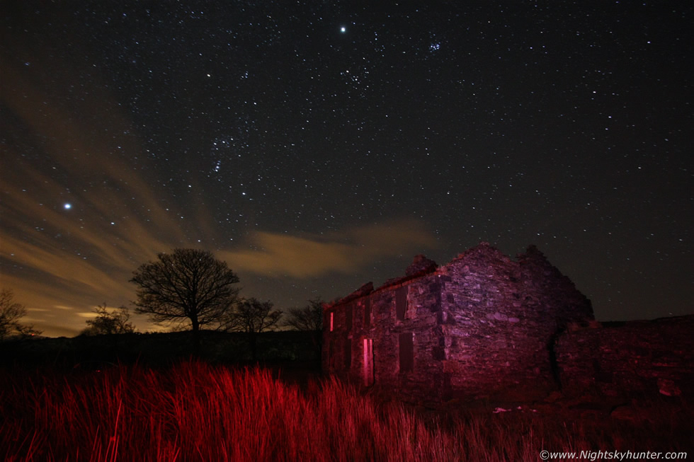An isolated derelict house on the vast marshland on top of Glenshane Pass during the early morning hours of a harsh Winter's night on November 17th 2012 using a 10mm lens. The Winter stars dominated the E sky with Sirius below left, Orion above the tree, Hyades above house, Pleiades nearby and brilliant planet Jupiter near the top of the frame. I was absolutely freezing during this lengthy photo shoot jumping up and down on the spot while clapping my gloved hands in a vain attempt to get warm however this atmosphere only added to the fond memory. * All images are available for sale in the form of photo prints, canvas or digital files for licensing, if you are interested in a purchase simply drop me an email. |