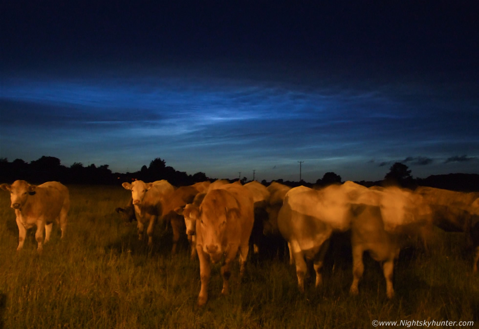 Noctilucent Clouds and cows outside Maghera on June 17th/18th 2009. These Cows were not shy and their curious nature over powered any fear they may have had, they were friendly Cows and eventually walked over to me and began sniffing the tripod and rubbing their noses against the metal legs, I had to detach the camera at one stage in case it got knocked over or covered in Cow breath. They then surrounded me and blocked my view of the NLCs for a period so I had to walk to another sector of the field then they would follow me once again, this strange pantomime continued. * All images are available for sale in the form of photo prints, canvas or digital files for licensing, if you are interested in a purchase simply drop me an email.