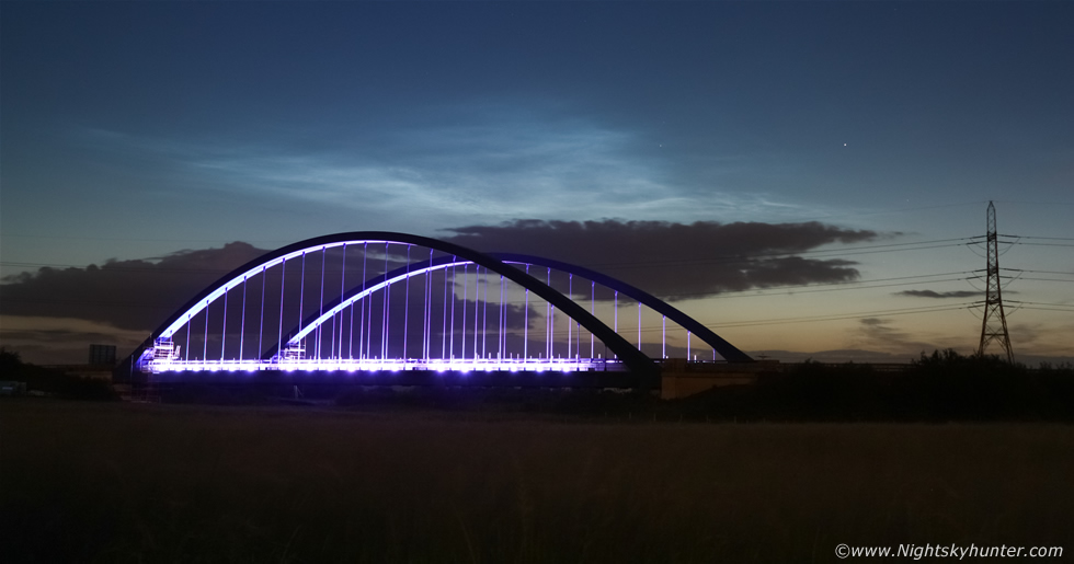 Glowing electric blue NLCs over the apex of Toome bridge on a beautiful Summer's night with both man made and nature illuminating the night sky in spectacular competition with golden Capella winking softly nearby on June 16th 2011. * All images are available for sale in the form of photo prints, canvas or digital files for licensing, if you are interested in a purchase simply drop me an email. |