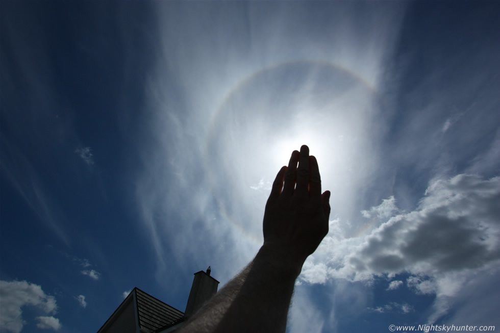 May 25th 2013. A 22 degree halo around the sun with subtle orange, yellow, and white colours against a background of crisp clean blue sky. The halo formed on tiny ice crystals present within this veil-like formation of cirrus cloud. Taken with a 10mm lens and using my hand to block the glare of the sun. * All images are available for sale in the form of photo prints, canvas or digital files for licensing, if you are interested in a purchase simply drop me an email.