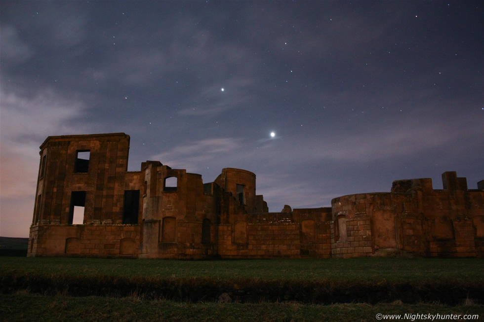 March 3rd 2012 on the cliffs near Downhill Beach along the Co. Derry coastline on an atmospheric moonlit night. This is the famous Downhill Estate with a beautiful conjunction between planets Venus and Jupiter above. The dark horizontal shaded area along the grass marks the location of a moat which surrounds the E side of the ruins so caution must always be used in the dark while doing photography at this historic landmark * All images are available for sale in the form of photo prints, canvas or digital files for licensing, if you are interested in a purchase simply drop me an email. |