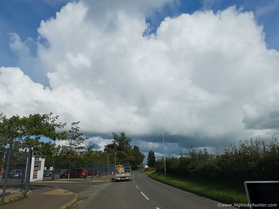 Trailing this glaciated cell and located to it's right was a single photogenic updraught with crisp cauliflower edges billowing up rapidly, image taken through the front windscreen. This was looking encouraging and the more I watched the more my adrenaline began to pump and the sharper my senses became. This was outside Portglenone, both cells would be over that very area when I planned to meet Colleen, perhaps it was a good omen. Little did I know it but this one updraught would evolve into one of the most structured storm cells of the entire season for us both. But that was in the future and we were completely unaware of what was to come, my mindset honestly was that I was just happy to see convection at all.