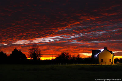 | An unexpected sunset sky show unfolded during the afternoon of November 30th 2014 while I was visiting in-laws within the Creggan countryside near Lough Neagh. A remarkable long duration sunset with rich orange, red, and yellow colours manifested in the dusk sky complimented by a complex formation of altocumulus clouds. The sunset remained into evening twilight accompanied by the moon and brighter stars which was something I had never experienced before. It was a personal thrill to photograph this amazing sight standing within a pitch black field in crisp frosty air with a country house covered with Christmas lights for company. One page report with 7 images. - REPORT. | ![]() |