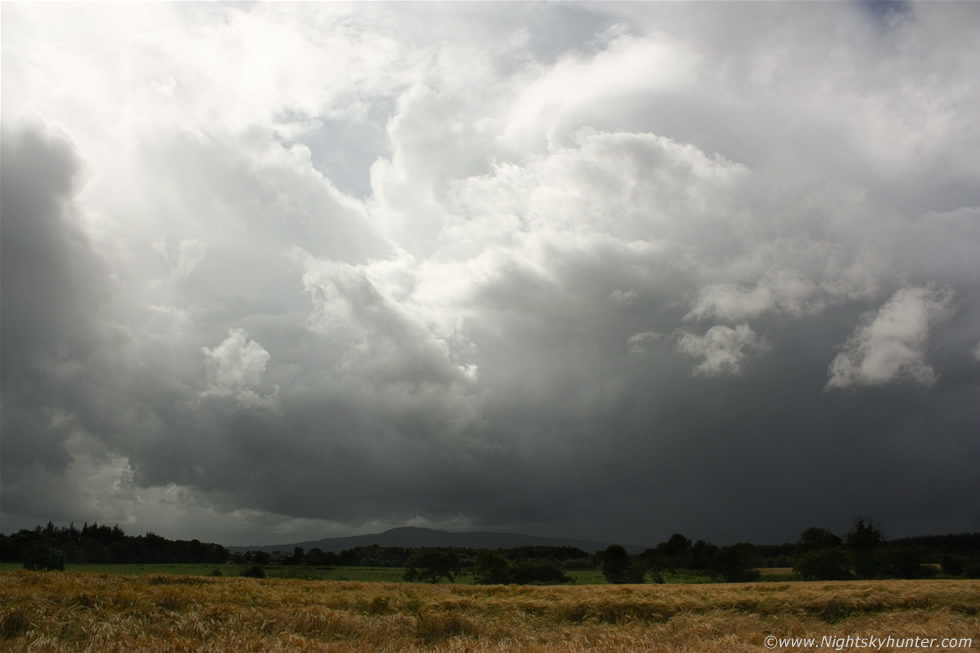 August 29th 2012. 1200 CAPE, LI's -4 in a SWly flow, Sky Warn UK had issued a severe thunderstorm watch and TORRO had a convective discussion released followed by a tornado watch. I recall being up all night watching the radar for night storms and eventually got to sleep at 06.00 then by 07.00 I was up again for round two monitoring the follow up daytime storms. Things had kicked of early, by midday a cluster of showers below the border exploded to life and turned into a line of thunderstorms once they crossed into N. Ireland as they slowly moved NE, I knew they would hit the mid Ulster area by early afternoon and I was ready for them. This line of storms was severe with huge tops because once the storm crossed the border I could see its various anvils and towers well up in the sky from Maghera!. I headed out chasing and targeted Glenshane Pass then took a minor road I had never been on before to seek a more quiet location, this road was just small enough for one car with very tall hedges on each side which blocked the sky, at one stage I parked and stood on the car roof so I could check the sky, I then found an opening in the ditch beside an old iron gate which was just about large enough to fit my car so I took a chance and parked there despite all the thorns visible around the wheels. I climbed the gate and set up my gear in this huge field of wheat which felt absolutely awesome, this atmospheric experience instantly puts a smile on my face even now as I write this. The smell of the field was strong as I stood waist deep within a sea of orange and brown stalks which gently stirred in the breeze then as the storm approached the wind swept an invisible hand across the grass like a gust across the ocean, it was pure magic as sweat dripped down my face in the heat and humidity. Here is the storm, that big line had split into two sections, the left section lacked any cloud structure however the sky was pitch black in that direction and I saw a lot of lightning and heard a shocking amount of thunder as that storm passed over Lough Neagh, Maghera and further NE into Antrim. The Right side was directly in front of me with it's dark base and heavy precip core over Slieve Gallion and rain free base behind, above you can see towers and an anvil as the storm moved past from left to right disturbing the wheat even more with thunder before it finally crossed the Sperrins heading for Co. Derry where it delivered more c-g lightning. This part of the line had the best structure and the view of it over the field made for a fantastic memory. My car roof still has a dent where I stood on it from this chase! * All images are available for sale in the form of photo prints, canvas or digital files for licensing, if you are interested in a purchase simply drop me an email. |