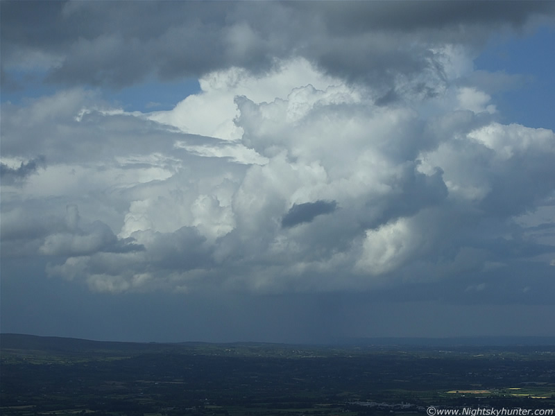 We hiked around the mountain for a while and climbed to its very top which is marked by a tall pile of rocks. It brought back memories of watching good storms from here in 2007 with Conor McDonald. Visible miles away to the NW was thunderstorm number two. I'm not certain exactly where it was located but it seemed not too far away from Maghera again. This is a zoomed shot looking at the very back of the cell as it moved into the distance. Heavy curtains of precip broke out and within that area could be seen blue c-g lightning followed by distance rumbles of thunder. It was a surreal scene to be sitting under hot sunshine with Buzzards calling, Butterflies fluttering around you, while thunder boomed at the same time. On the image you can just see a section of the anvil, the rest of it extends up behind that mid level cloud and high up into the atmosphere out of the frame. Note the dark lowering under the cell to the ROH behind the rain. It was too far away to notice rotation but I suspect that actually could be another funnel.